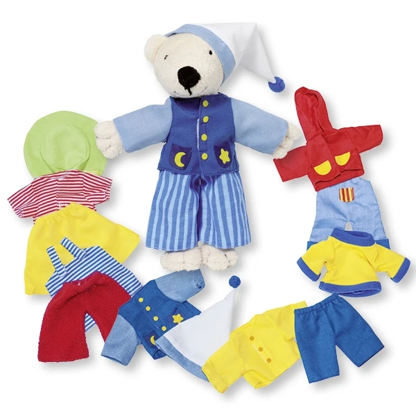 Tinba de vrolijke Beer heeft altijd een passende outfit. Of het nu is om te sporten, voor een uitstapje, bedtijd of welk weertype dan ook; voor iedere gelegenheid heeft hij een kledingset in zijn garderobe.