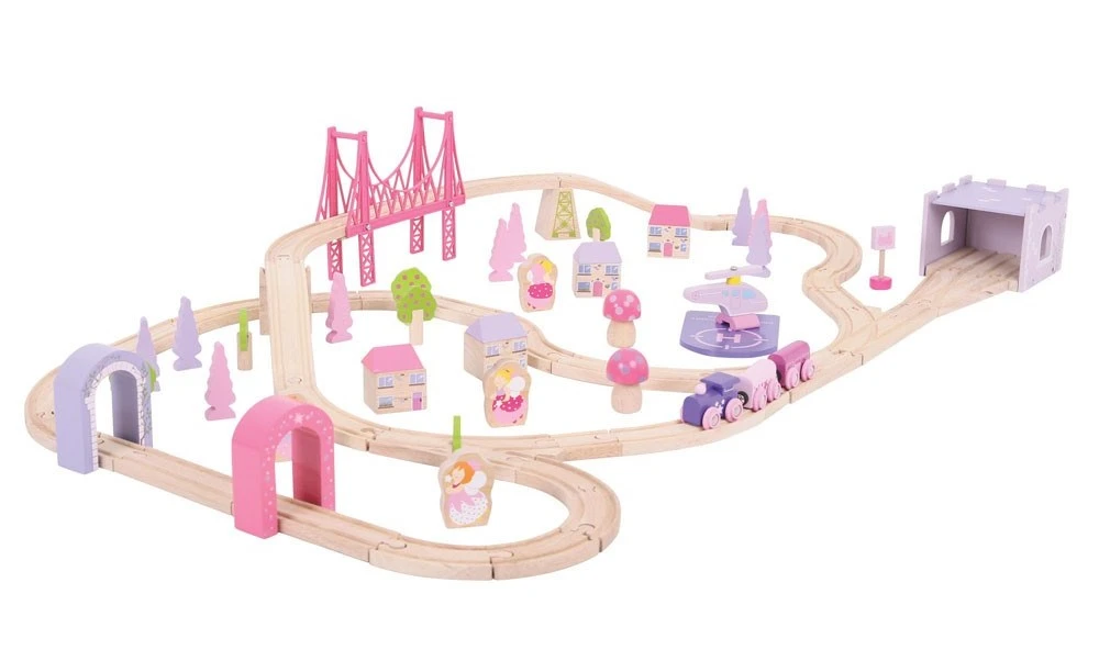 Treinset Sprookjesstad BigJigs BJT023. Fraaie 75 delige BigJigs houten treinset met als thema ”sprookjes”! De set is o.a. voorzien van rails, bomen, trein, helicopter, brug, huizen en sprookjesremise. Afmetingen: 114 x 70cm. Geschikt voor kinderen vanaf 3 jaar.