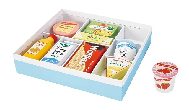 Dit negen delige setje bevat speelgoed-voedingsmiddelen die je koel moet bewaren voor de kleine kok. Een prachtige aanvulling voor de kinderspeelkeuken of speelwinkel. Varieer met de verschillende producten en verzamel zo de dagelijkse boodschappen. Spelen met deze boodschappen is zowel leuk als leerzaam en bevordert de creativiteit van kinderen. Deze boodschappen set van New Classic Toys is onderdeel van de Bon Appetit productlijn. Snijden, bakken, koken en aan tafel! De potjes, pannetjes, snijsetjes en keukentjes zijn absolute musthaves voor kleine keukenprinsjes en -prinsesjes.