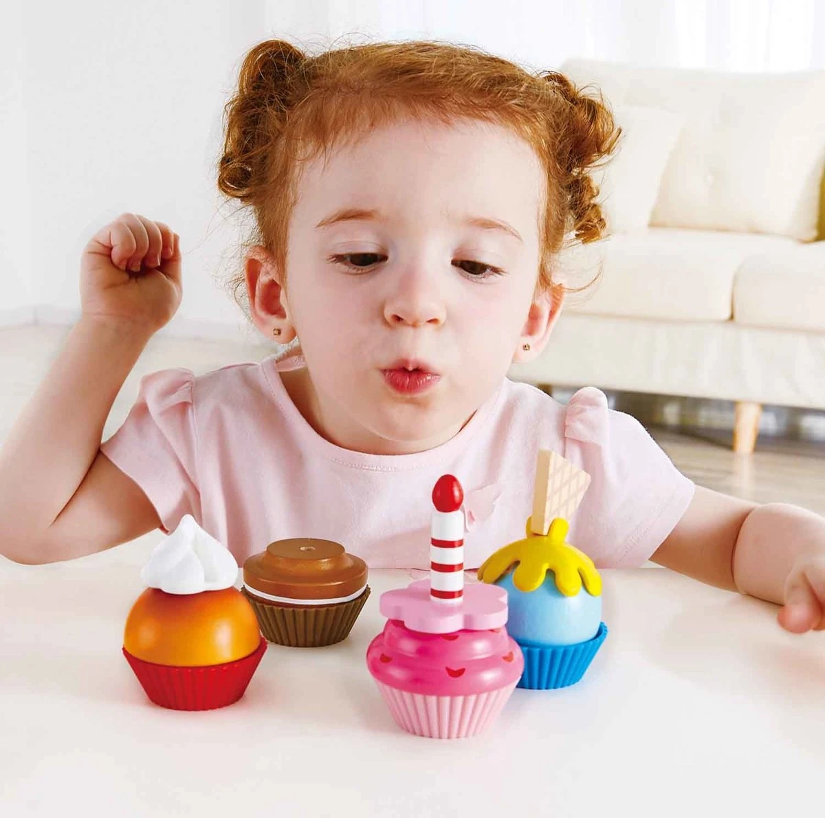 Tijd voor een zoete traktatie! Creëer je eigen speelcakejes met deze speelset met vier cupcakes en allerlei spectaculaire toppings waaronder een kaarsje, fruit en een wafeltje.