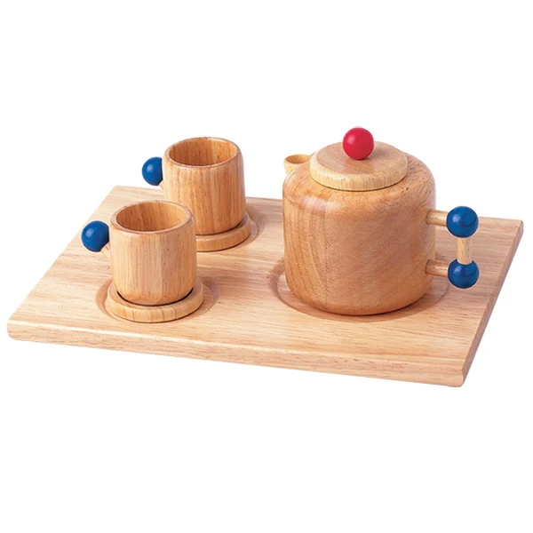Zoals afgebeeld bestaat de set uit een dienblad met theepot en 2 kopjes met schotel.