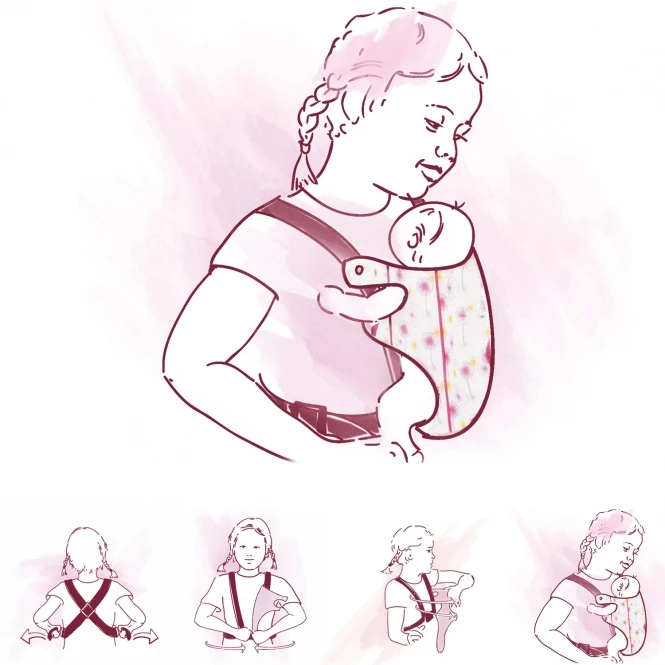 Als je gaat wandelen, kruipt je babypop tegen je aan en heb je je handen vrij. Een praktische drager in zachte kleuren. Je hebt maar een paar klikken nodig tot de drager goed past en je pop een veilige zitplaats heeft.