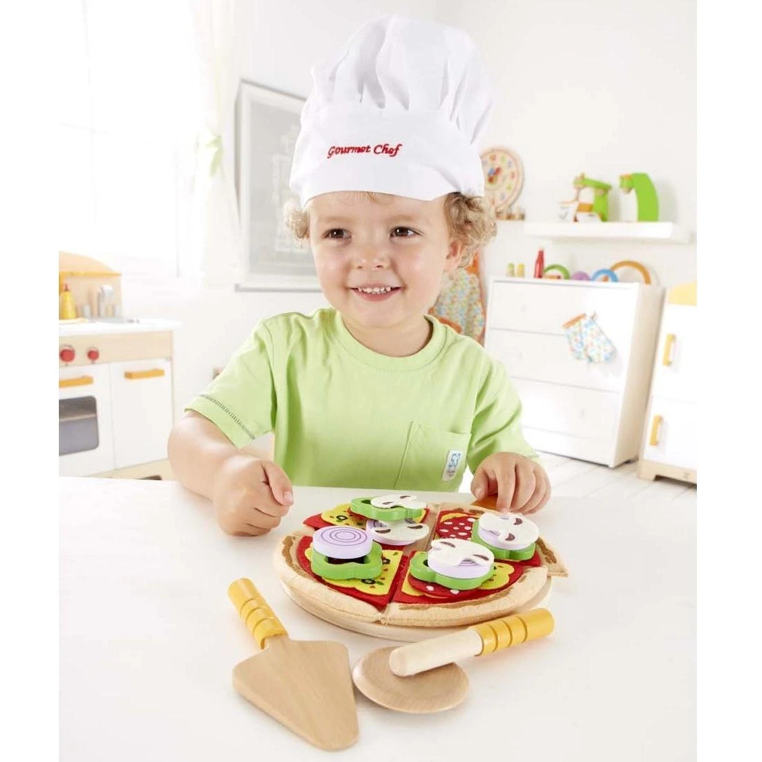 Extra kaas? Niet teveel peper! Met deze 31-delige houten Hape set kunnen kinderen nu hun favoriete pizza maken. Inclusief pizzasnijder en verschillende andere accessoires.