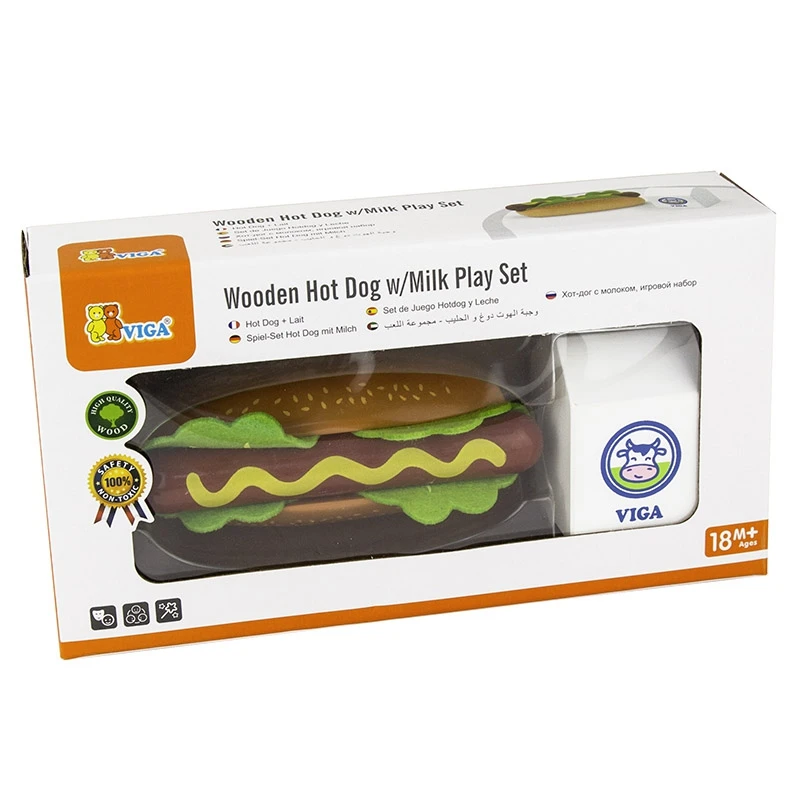 Deze hotdog ziet er uit om direct in te bijten, maar beter niet doen want hij is van hout! Hij bestaat uit het bekende broodje met knakworstje + blaadjes sla (gemaakt van vilt) en een pakje melk om de dorst te lessen, eet smakelijk!
