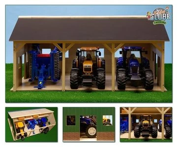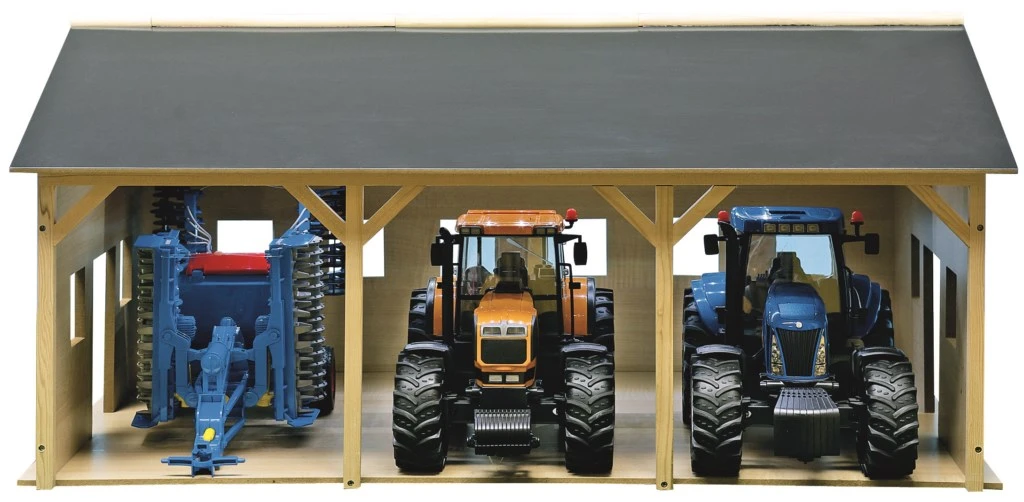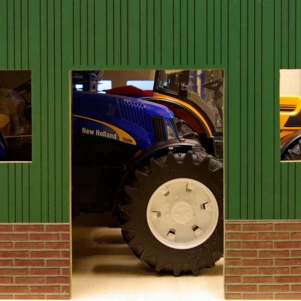 In deze tractor loods passen 3 voertuigen met een schaal van 1:16, zoals alle Bruder tractoren.