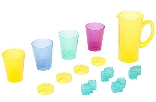 - De set bestaat uit: 1 sapkan, 4 gekleurde glazen, ijsblokjes en schijfjes citroen