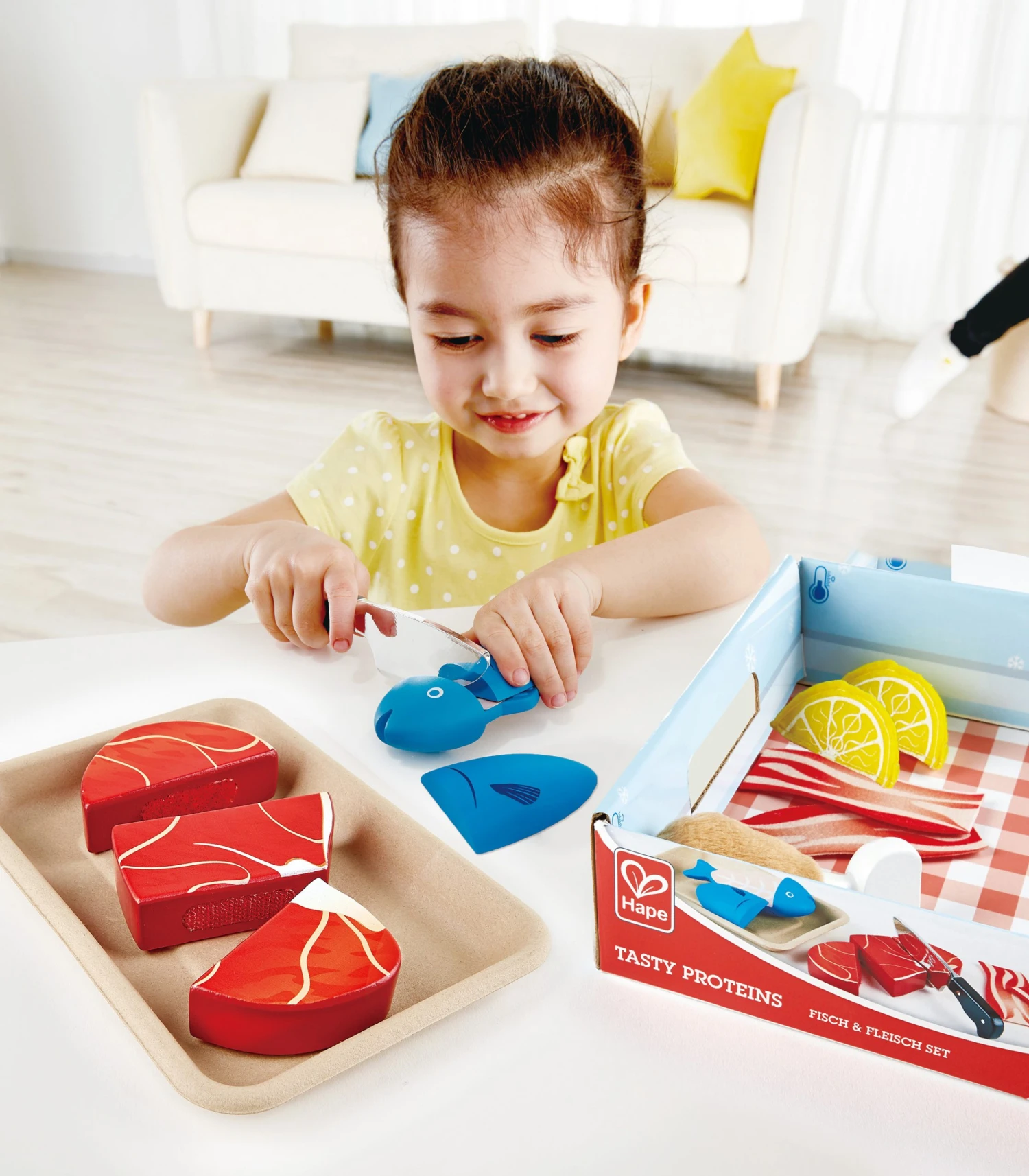 Eiwitten zijn belangrijk om spieren op te bouwen. Oefen met deze realistische keukenspeelset hoe je eten zoals rundvlees, kip, vis en spek klaarmaakt. Met speelmes en schijfje citroen.